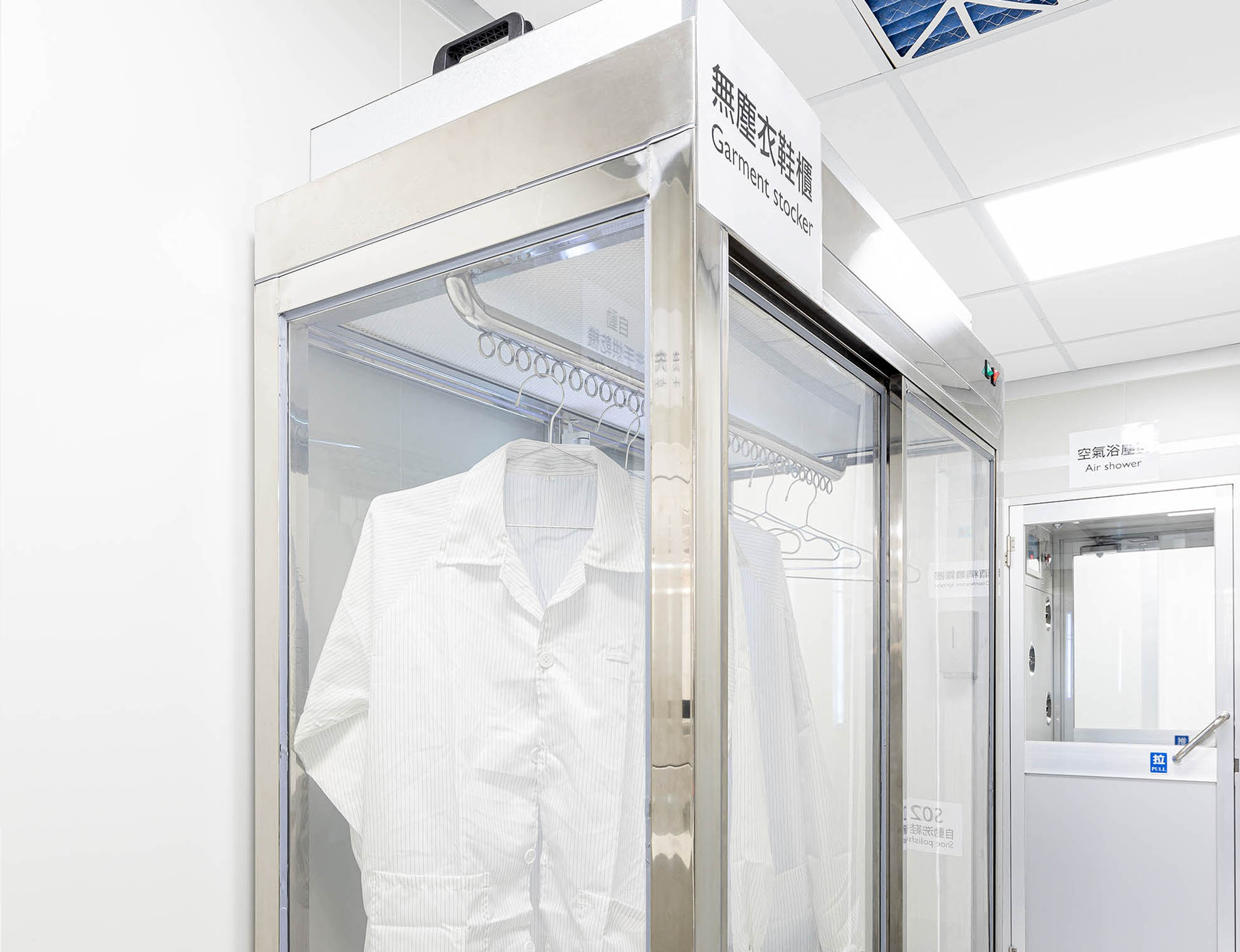 全套無塵衣著用比照電子及半導體工廠無塵室的生產環境,工作時全套無塵衣著用,過濾灰塵及不掉棉絮。